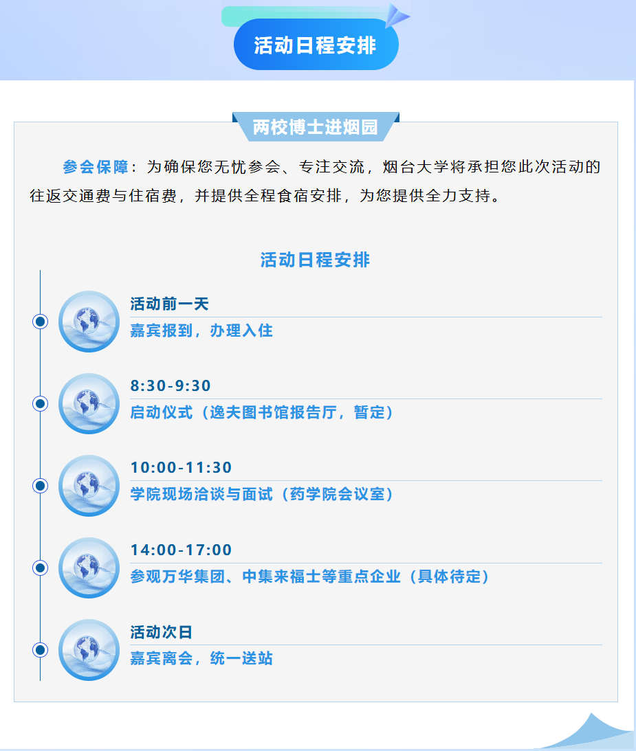 本次活动将为您全面推介烟台市与烟台大学的优厚人才政策与广阔发展平台。诚盼您莅临交流,在黄海之畔,与我们共拓药学深蓝!